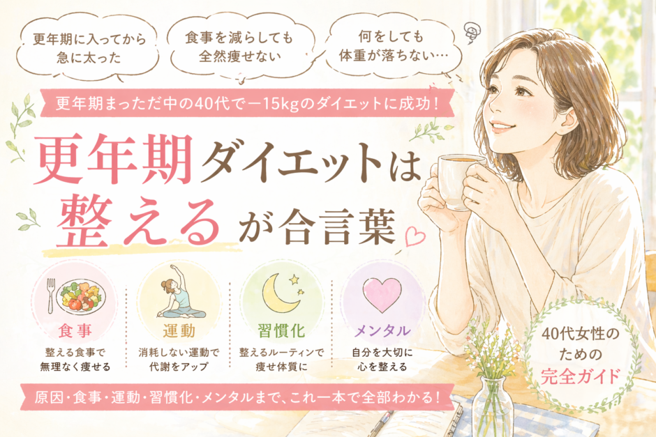 この記事では、更年期ダイエットで知っておくべきことをすべてまとめてお伝えします。原因・食事・運動・習慣化・メンタルまで、これ一本で全部わかります。